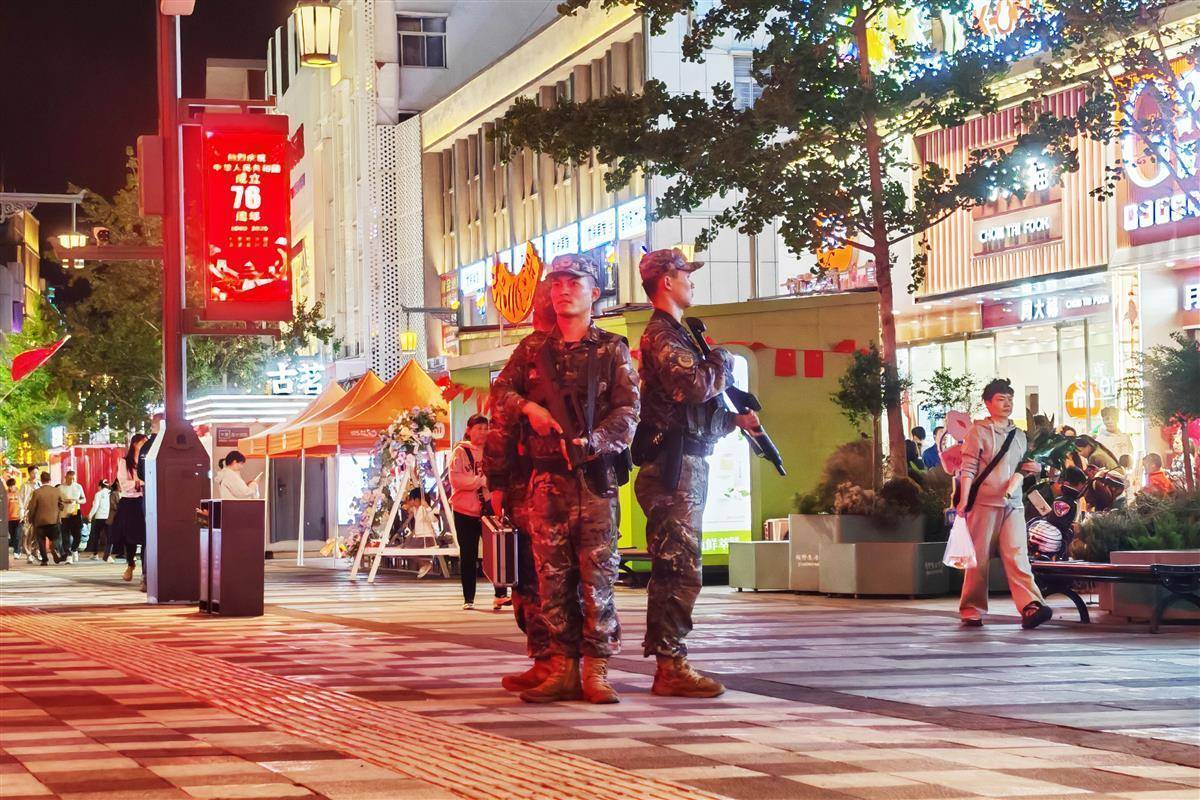 国庆中秋长假,武警湖北总队荆门支队官兵在火车站、城市重点商圈,全面加强社会面巡逻管控,为市民游客营造安全和谐的节日环境。